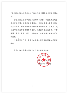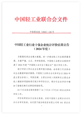 2025年7月9日,中国轻工业联合会发布《中国轻工业行业十强企业统计评价结果公告》(中轻联信统(2025)136号),发布了我国轻工业各行业的“2024年度中国轻工业行业十强企业”名单。