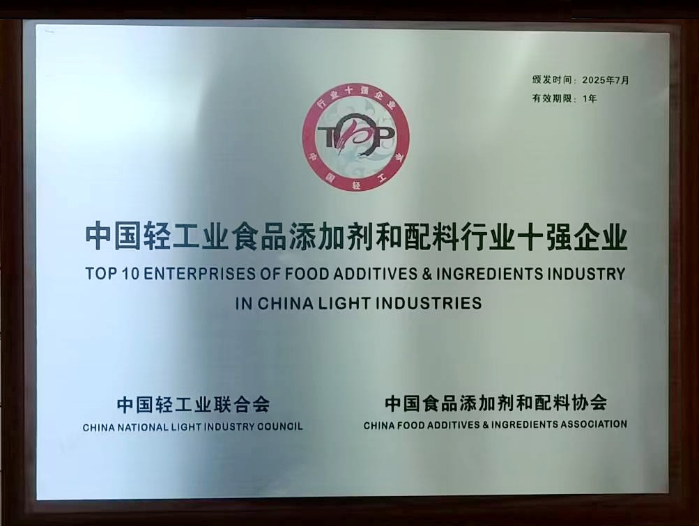 金城化学(江苏)有限公司再次荣获“2024年度中国轻工业食品添加剂和配料行业十强企业”荣誉称号。