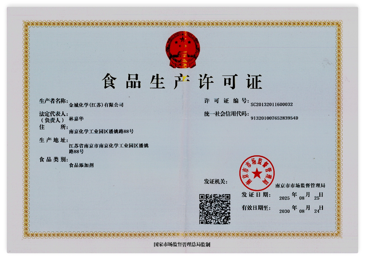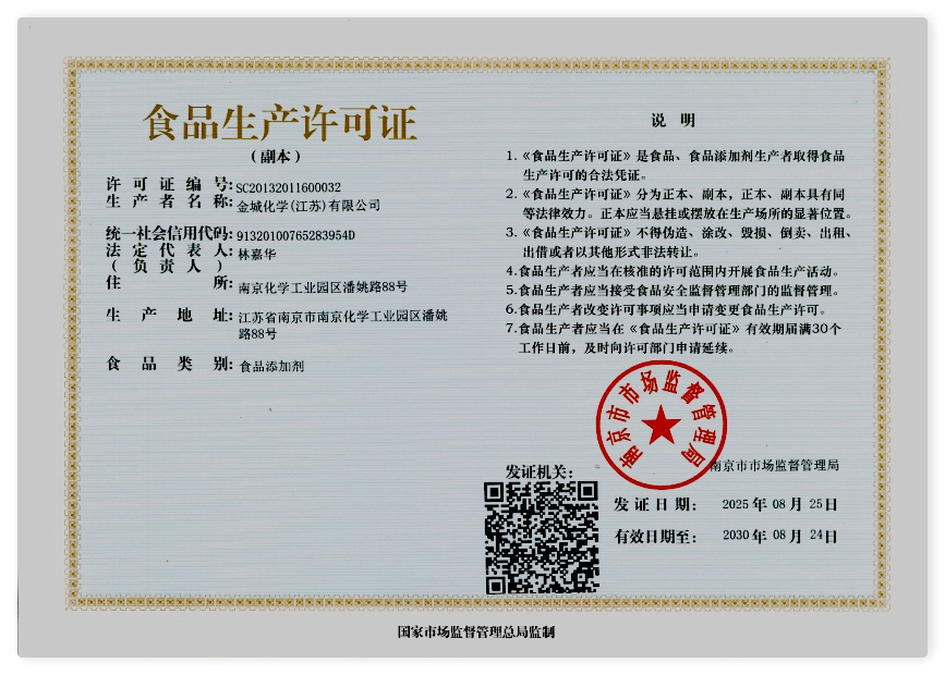2025年9月8日,我司取得新的食品生产许可证,食品添加剂环己基氨基磺酸钠(甜蜜素)和复配甜味剂生产许可资质顺利延续至2030年8月。