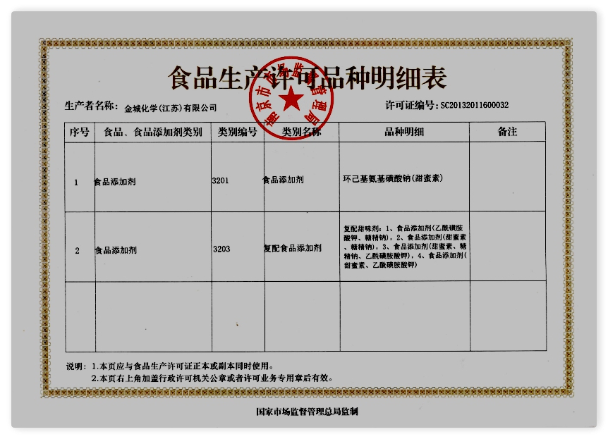 我司顺利延续甜蜜素和复配甜味剂食品生产许可资质
